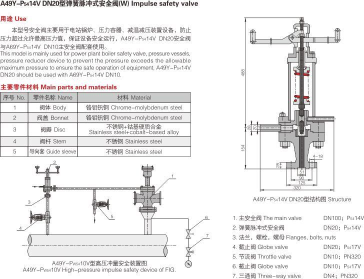 A69Y-P5414VDN20型彈簧脈沖式安全閥主要用于電站鍋爐、壓力容器、減溫減壓裝置設備,防止壓力超過允許z高壓力值,保證設備安全運行,A69Y-P5414VDN20彈簧脈沖式安全閥與A49Y-P5414VDn10主安全閥配套使用